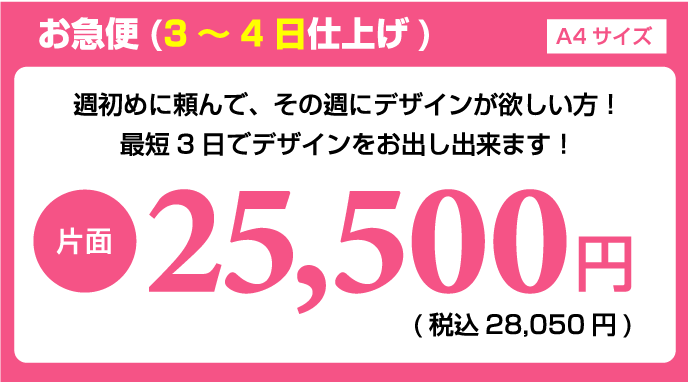 チラシデザイン作成、制作の強み 弊社の一番の強みは、低価格でハイクオリティーなチラシデザインの作成です。一般的な地元広島のデザイン会社ですと、チラシデザイン代片面で3万~4万が相場だと思います。 確かに安い業者はあるのですが、クオリティー的にプロとは言えないレベルのデザインの作成をし、一万円以下で販売もしている業者もいますが、対応のスピードや作品の質に疑問を感じます。広島チラシ作成.comではデザイナー全員が数年間の実務経験を経験しているデザイナーを多数抱えている為、低価格でのデザイン制作が可能になりました。 制作依頼前にラフデザインをご依頼者様に提出する為、お客様のイメージにより近いチラシのデザインを作成しております。よくお会いしてチラシデザインの打ち合わせをしたいというお客様もいらっしゃいますが、弊社は低価格での提供を考えておりますのでやり取りは、電話やメール、FAXなどで対応しております。また、 修正などもお客様がご納得していただくまで、何度でもチラシデザインの修正を承っております。 続いて、チラシデザインの制作スピードに関しましても、最短で当日・翌日仕上げの特急便、2~3日で完成するお急ぎ便の2種類をご用意しております。 チラシデザインの特急便はA4サイズの場合、片面34000円~でお受けしております。チラシデザインのお急ぎ便は片面25500円~でお受けしております。お急ぎの場合は、是非弊社の担当者までお気軽にお問合せいただければ幸いです。 スピードを求めないのでしたら、弊社で1番のお勧めはチラシ印刷パックをオススメしております。一番安いプランですと、チラシデザイン+印刷でA6サイズ100枚で税抜5980円からオススメしております。A4サイズでの最安パックは、チラシデザイン+印刷+送料込みで100枚で9,100円でお受けしております。 また他に何かわからないことがございましたらなんなりとお気軽にお問合せください。