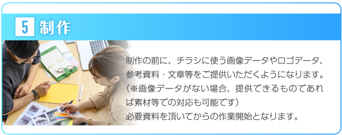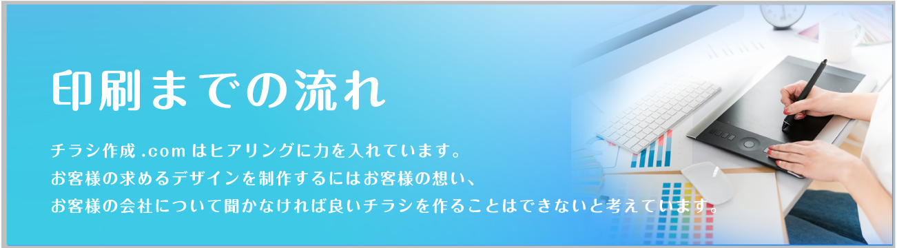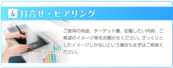 広島チラシ作成.comでは、お客様の思いを形にするため、ヒアリングに力をいれております。何を伝えていいかわからないという方も多いかと思いますが、好きな色、思い、こんなことをしたいなど、ざっくりとしたイメージで構いませんので、担当スタッフにお伝えください。それを形にするのがプロの私たちの仕事ですので、安心してお任せしていただければと思います。