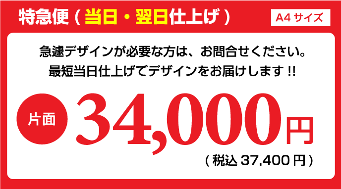チラシデザイン作成、制作の強み 弊社の一番の強みは、低価格でハイクオリティーなチラシデザインの作成です。一般的な地元広島のデザイン会社ですと、チラシデザイン代片面で3万~4万が相場だと思います。 確かに安い業者はあるのですが、クオリティー的にプロとは言えないレベルのデザインの作成をし、一万円以下で販売もしている業者もいますが、対応のスピードや作品の質に疑問を感じます。広島チラシ作成.comではデザイナー全員が数年間の実務経験を経験しているデザイナーを多数抱えている為、低価格でのデザイン制作が可能になりました。 制作依頼前にラフデザインをご依頼者様に提出する為、お客様のイメージにより近いチラシのデザインを作成しております。よくお会いしてチラシデザインの打ち合わせをしたいというお客様もいらっしゃいますが、弊社は低価格での提供を考えておりますのでやり取りは、電話やメール、FAXなどで対応しております。また、 修正などもお客様がご納得していただくまで、何度でもチラシデザインの修正を承っております。 続いて、チラシデザインの制作スピードに関しましても、最短で当日・翌日仕上げの特急便、2~3日で完成するお急ぎ便の2種類をご用意しております。 チラシデザインの特急便はA4サイズの場合、片面34000円~でお受けしております。チラシデザインのお急ぎ便は片面25500円~でお受けしております。お急ぎの場合は、是非弊社の担当者までお気軽にお問合せいただければ幸いです。 スピードを求めないのでしたら、弊社で1番のお勧めはチラシ印刷パックをオススメしております。一番安いプランですと、チラシデザイン+印刷でA6サイズ100枚で税抜5980円からオススメしております。A4サイズでの最安パックは、チラシデザイン+印刷+送料込みで100枚で9,100円でお受けしております。 また他に何かわからないことがございましたらなんなりとお気軽にお問合せください。