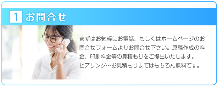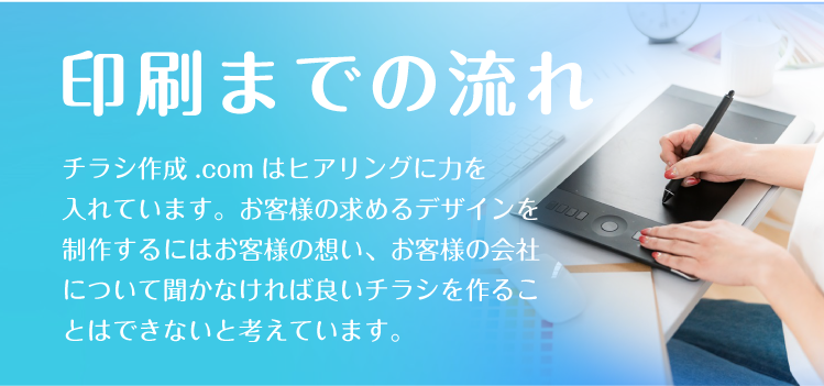 広島チラシ作成.comでは、お客様の思いを形にするため、ヒアリングに力をいれております。何を伝えていいかわからないという方も多いかと思いますが、好きな色、思い、こんなことをしたいなど、ざっくりとしたイメージで構いませんので、担当スタッフにお伝えください。それを形にするのがプロの私たちの仕事ですので、安心してお任せしていただければと思います。